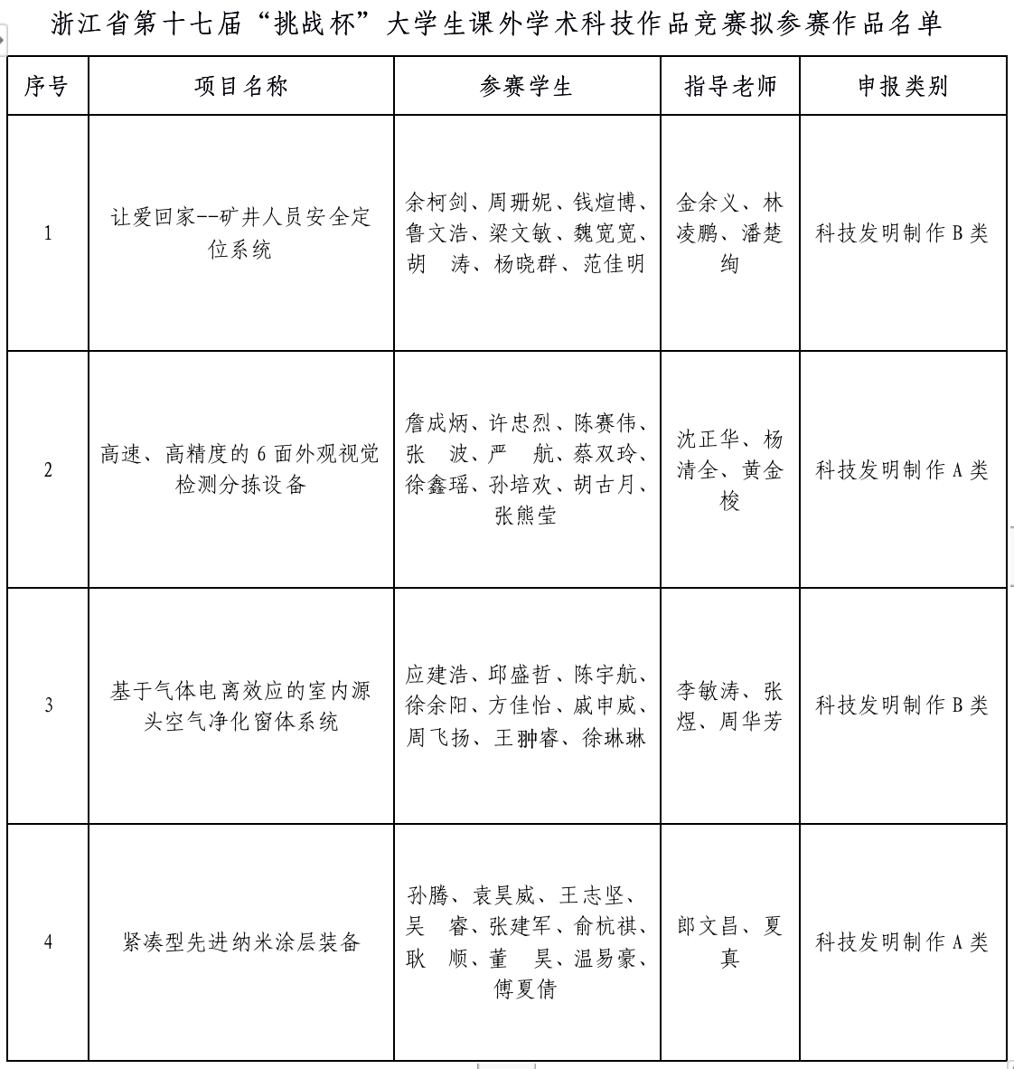 根据《关于组织开展浙江省第十七届“挑战杯”大学生课外学术科技作品竞赛的预通知》相关要求,经温州职业技术学院“挑战杯”校赛公开、公正、公平的选拔,现拟推荐《让爱回家--矿井人员安全定位系统》《高速、高精度的6面外观视觉检测分拣设备》《基于气体电离效应的室内源头空气净化窗体系统》《紧凑型先进纳米涂层装备》四个作品参加浙江省第十七届“挑战杯”大学生课外学术科技作品竞赛,以上参赛团队中周珊妮、鲁文浩、詹成炳、应建浩、邱盛哲、戚申威、方佳怡、周飞扬、王翀睿、袁昊威、王志坚、吴 睿、张建军、俞杭祺、耿 顺、董 昊均为日本色情片 学生。现将相关作品信息予以公示。