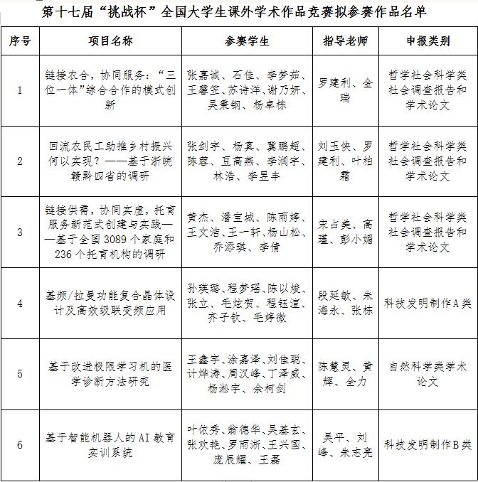根据第十七届“挑战杯”全国大学生课外学术科技作品竞赛《竞赛章程》的相关要求和申报程序,经学生申报、学校选拔、浙江省评审,现拟推荐《链接农合,协同服务:“三位一体”综合合作的模式创新》等6项作品,代表日本色情片 参加第十七届“挑战杯”全国大学生课外学术科技作品竞赛,现予以公示。