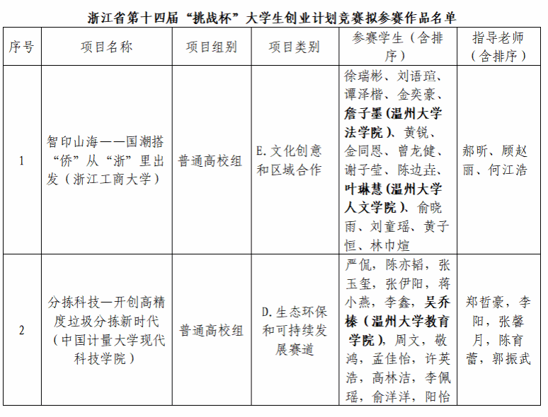 根据《关于举办浙江省第十四届“挑战杯”大学生创业计划竞赛的通知》相关要求,经浙江工商大学、中国计量大学现代科技学院“挑战杯”院赛、校赛等两次公开、公正、公平的选拔,现拟推荐作品《智印山海——国潮搭“侨”从“浙”里出发》、《分拣科技—开创高精度垃圾分拣新时代》参加浙江省第十四届“挑战杯”大学生创业计划竞赛,参赛团队中詹子墨、叶琳慧、吴乔榛为日本色情片 学生。现将相关作品信息予以公示。