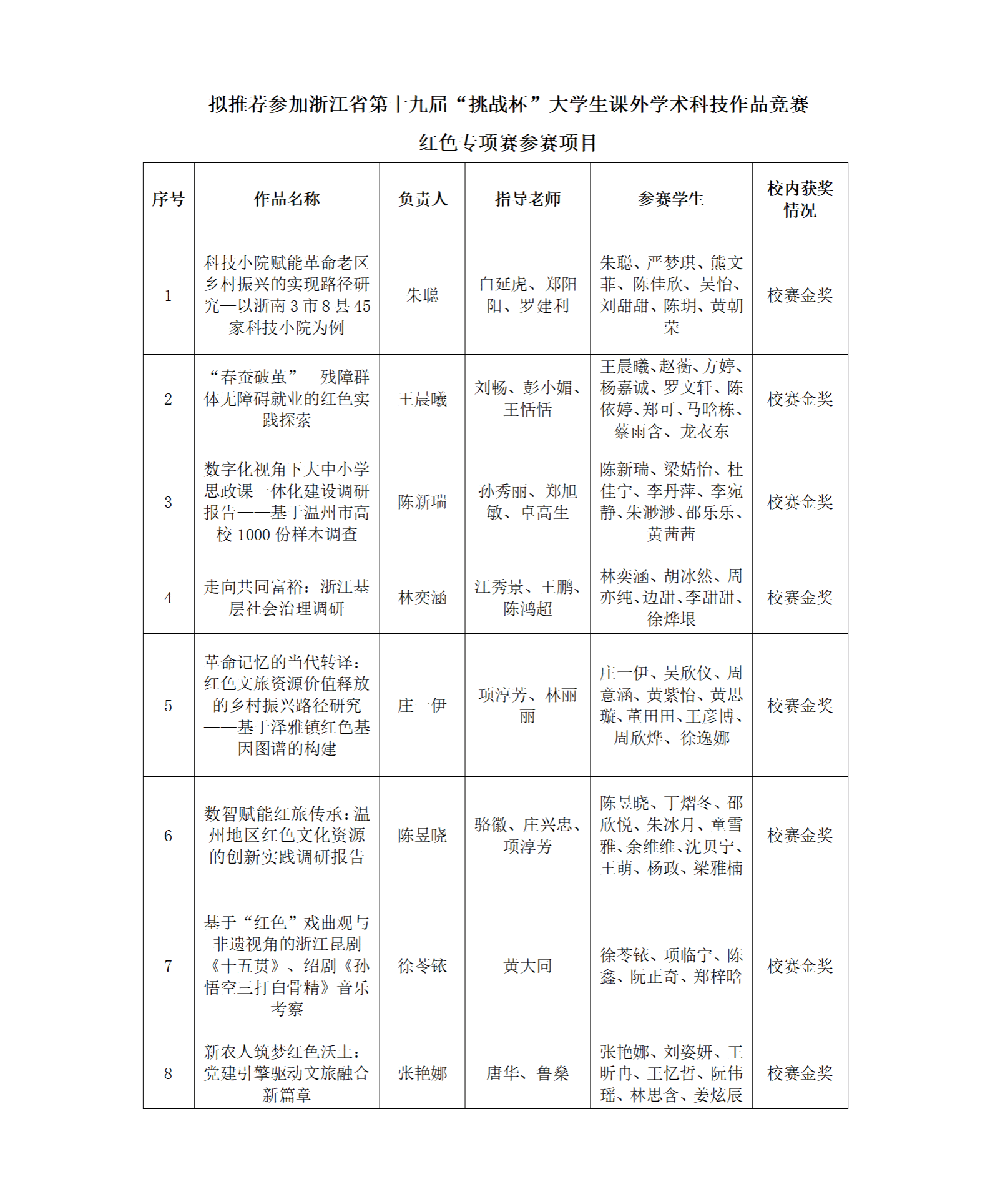 根据《关于组织开展浙江省第十九届“挑战杯”大学生课外学术科技作品竞赛红色专项赛的通知》相关要求,经学校“挑战杯”红色专项公开、公正、公平的选拔,现拟推荐《科技小院赋能革命老区乡村振兴的实现路径研究—以浙南3市8县45家科技小院为例》等8项作品代表日本色情片 参加浙江省第十九届“挑战杯”大学生课外学术科技作品竞赛红色专项赛。现将相关作品信息予以公示。