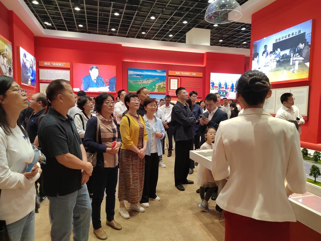 4500平方米的展厅内,大气恢弘的主色调一如浙江奋进的20年。大量详实的文字、鲜活的图片和实物及现代化的多媒体展示,讲述着6500多万之江儿女正坚定不移沿着习近平总书记指引的道路,始终干在实处、走在前列、勇立潮头,奋力谱写中国式现代化浙江新篇章的故事。本次主题展览综合区分为“伟大擎画”“精彩蝶变”“勇立潮头”三部分,聚焦习近平总书记走过的足迹、擘画的印迹、牵挂的心迹,集中展现了习近平新时代中国特色社会主义思想在浙江的实践历程,立体呈现了在“八八战略”指引下,20年来浙江全领域各方面发生的精彩蝶变,生动诠释了“八八战略”的提出背景、实施历程及现实意义,充分彰显了“八八战略”的真理力量和实践伟力。