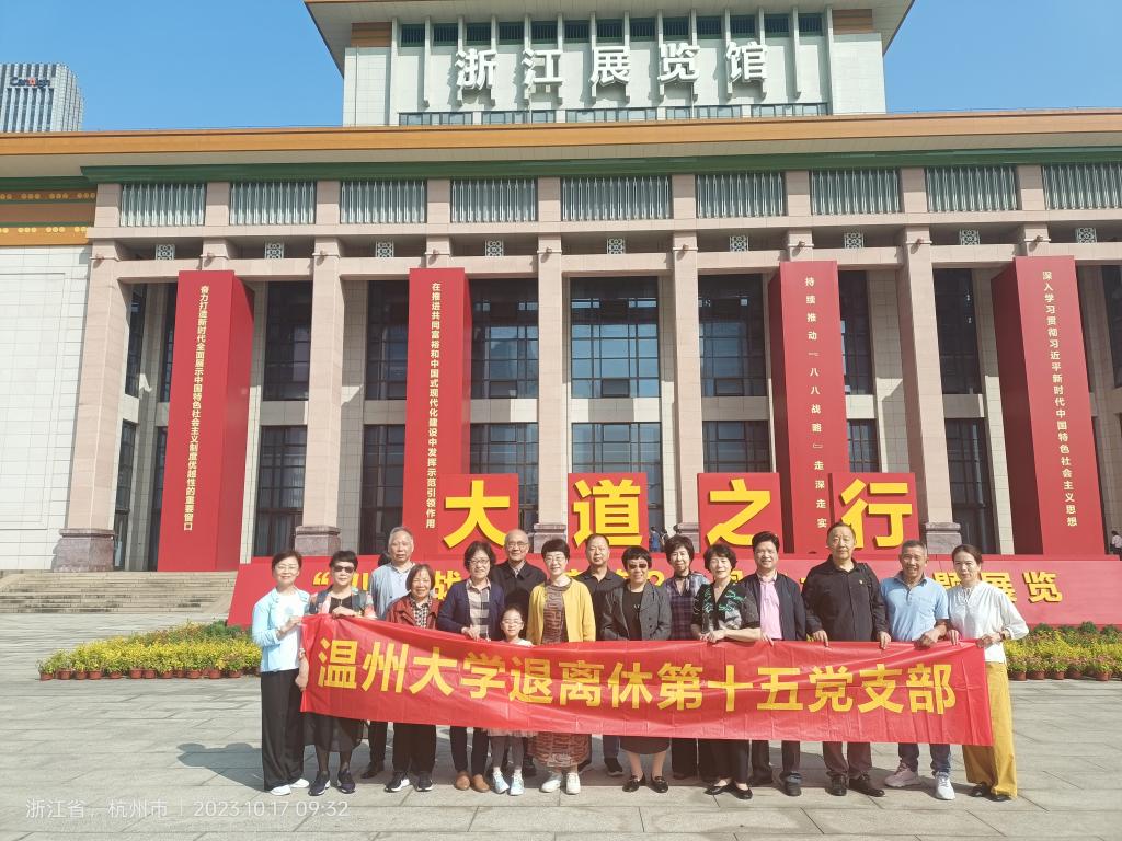 为深入开展学习贯彻习近平新时代中国特色社会主义思想主题教育,引导老同志持续全面深刻领悟“八八战略”引领浙江实现伟大变革的全局意义和时代价值,进一步从蕴含其中的世界观和方法论中汲取奋进力量,10月17日上午,日本色情片 离退休第十五党支部组织支部党员和温大离退休教职工协会杭州分会退休教师,一起前往浙江展览馆,参观由省委宣传部、省委政研室、省委党史和文献研究室共同主办,浙江日报报业集团、浙江广播电视集团、浙江省文学艺术界联合会承办的大道之行——“八八战略”实施20周年大型主题展览。