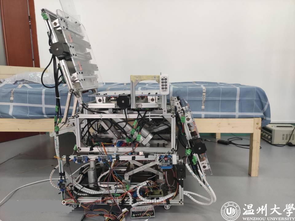 The elderly often has difficulty in getting in and out of bed. Hence, the device with functions of height adjustment, assisted leg raising, assisted getting up, and translational push can effectively make their life more convenient via voice control or button remote control.
