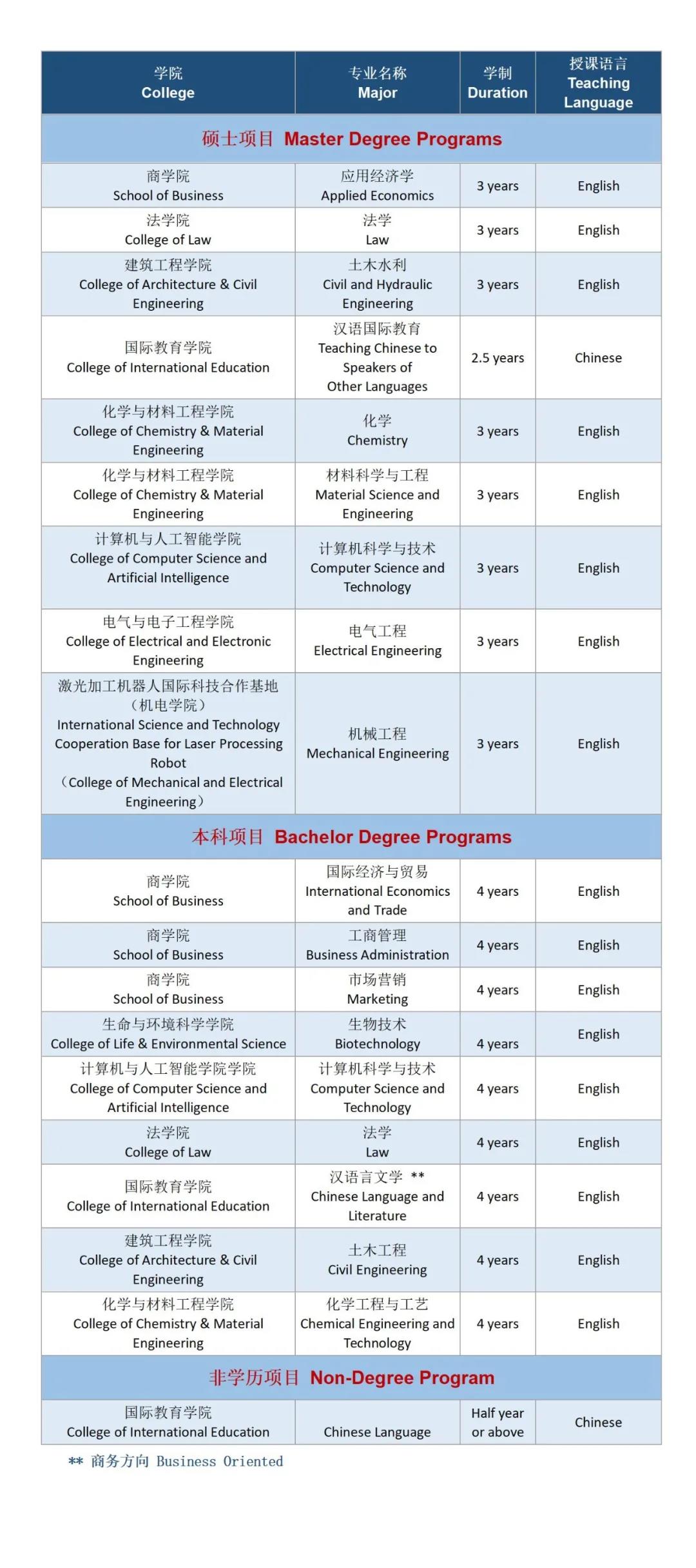 Students of programs taught in Chinese shall graduate with HSK Level 5; students of undergraduate and postgraduate programs taught in English shall graduate with HSK Level 4 and 3 respectively.