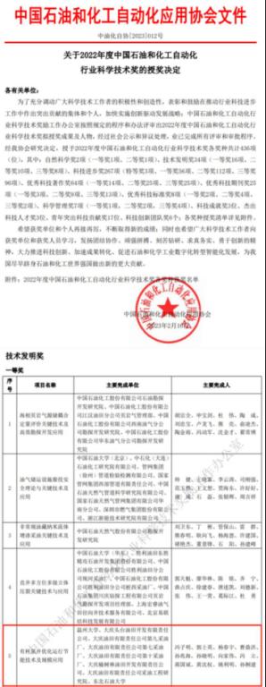 Recently, China National Association for Automation in Petroleum and Chemical Industry announced the winners for the 2022 China Petroleum and Chemical Automation Industry Science and Technology Awards. The project of "Optimization and Energy-saving Technology for Rod-pumped Wells and Its Scale Application", completed by Professor Feng Ziming, Professor Xiang Jiawei, and Associate Professor Huang Shenquan from the College of Mechanical & Electrical Engineering, with Wenzhou University as the first completion unit, was awarded the first prize for the 2022 Science and Technology Invention Award in petroleum and chemical automation industry.