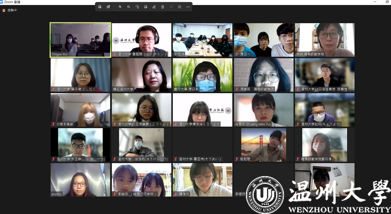 On the afternoon of November 13, 2021, 35 teachers and students from 5 universities, including Wenzhou University, I-Shou University, Lingnan Normal College, Matsumoto University, and Dongshin University participated in the Conference of China-Japan-ROK International Cultural Exchange via video links. This event is also a preparatory meeting for the upcoming China-Japan-ROK International Cultural Exchange Forum to be held on December 18th to 19th. Professor Shigeo ITOI of Matsumoto University moderated this meeting. Professor Yang Hong, the Director of Department of Japanese Language and Vice Dean of School of Foreign Studies, Wenzhou University, Zhan Zhimin, the teaching staff and nine Year-1 students majoring in Japanese from Wenzhou University participated in the event. The heads of the 5 universities conducted detailed discussions on the agenda of the upcoming International Cultural Exchange Forum. And the nine students from Wenzhou University introduced the university, Wenzhou cuisine, local tourist attractions, etc. to Japanese and South Korean students in fluent Japanese. Their narration was well liked by other participants.