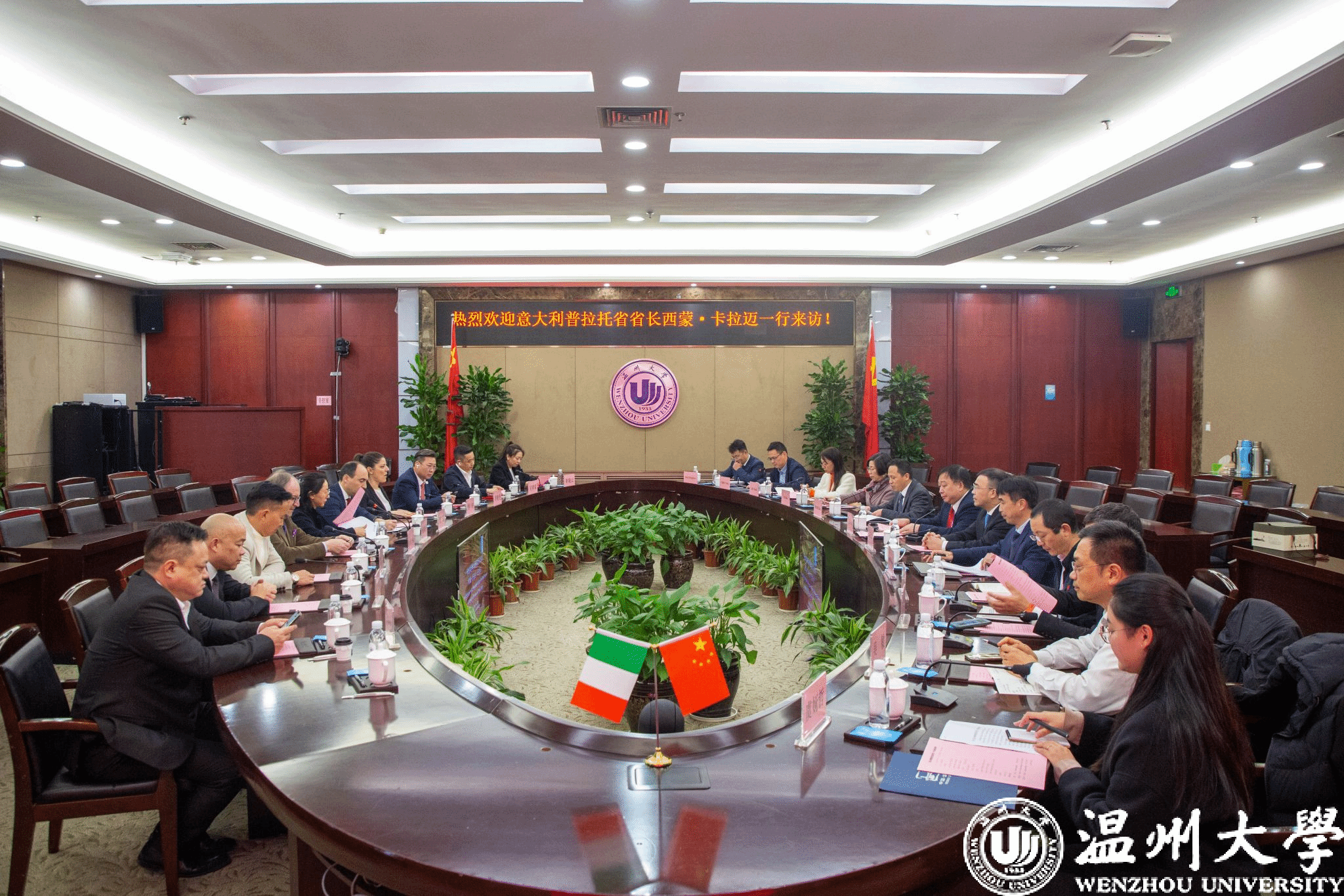 On March 11th, Simone Calamai, President of Prato Province, Italy, led a delegation to visit our university for discussions and exchanges. President ZHAO Min and Director ZHOU Junwu of the  Foreign Affairs Office of Wenzhou Municipal People’s Government attended the meeting. Vice President WANG Shun presided over the event.
