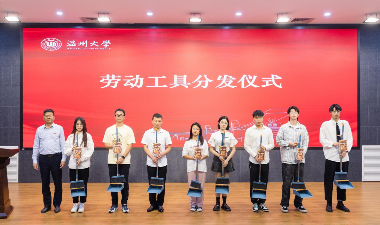 在劳动工具颁发仪式上,校党委副书记庄兴忠以及各职能部门负责人为各学院学生代表分发了劳动工具,随后各学院学生代表赴劳动包干区开展劳动,用行动真切地感受劳动的内涵与价值。
