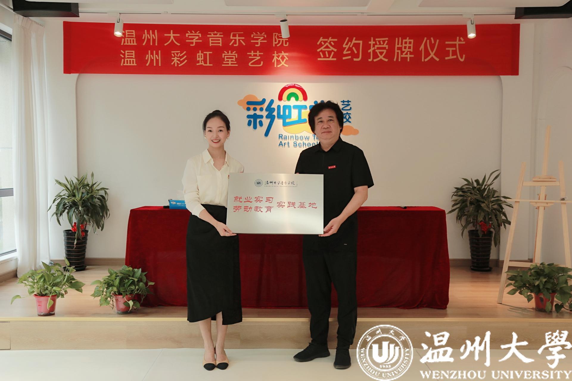 吴金法一行在两所艺术学校校长的陪同下参观了两所艺校的建设与发展情况,深入了解艺校团队建设及品牌活动开展情况。随后的座谈会与签约仪式上,双方代表就音乐学院与校友企业的相关情况做简要交流汇报,院党委书记朱启鑫与彩虹堂艺校黄雪娇校长、天之音好童星艺校陈红红校长现场签订双方“就业实习”基地协议与“劳动教育”基地协议,院长邹跃飞为两所艺校进行授牌。