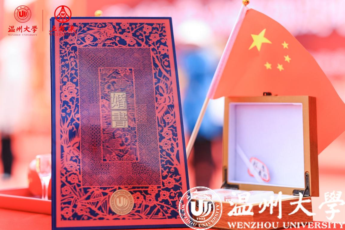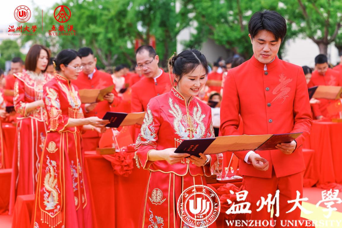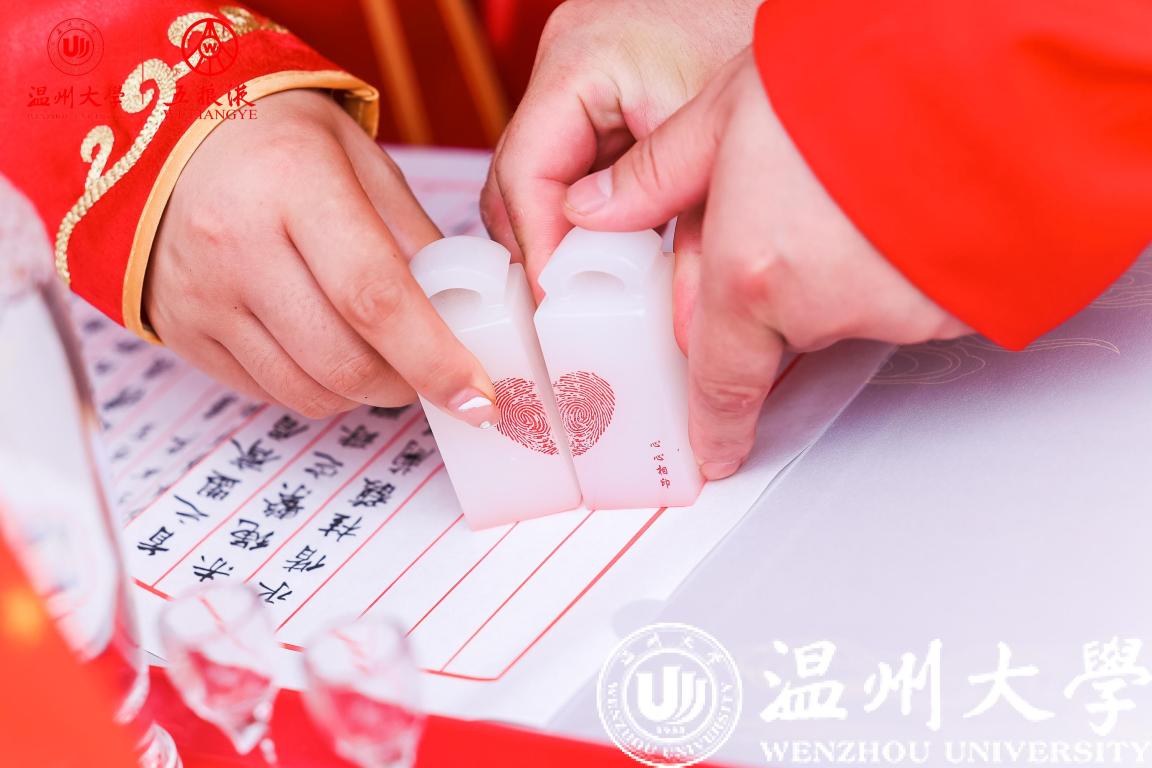 校友伉俪在全体亲友、来宾、师长、同学的见证与祝福中行执手礼、同牢礼,用定制的玉石印章在纪念婚书上烙下自己的幸福印记,许下“执子之手,与子偕老”的誓言,温大人用温大方式讲述最美的爱情故事。最后,全场挥舞国旗,齐唱《歌唱祖国》,用歌声向祖国深情告白,诉说着温大人对祖国与母校的美好祝福,用青春诠释爱国奋斗精神,用行动奏响时代乐章。