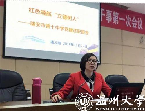 2017年我当选为温州市和瑞安市党代表。在瑞安十中任党总支书记兼德育副校长期间,实施红色领航“立德树人”行动,我的理念一直是党建要和教育教学相融合,优秀品质的养成需要亲身实践,我们身边的榜样最能触动人心。因此,校内各区域宣传空间、廉政文化等专栏都是我们师生自己的作品。我们结合党员义务值日,祭奠西山烈士英魂,送文化下乡等传统项目,创新开出系列微型党课、致善论坛,力争每位党员教职员工,都在各自岗位发挥先锋领航作用。在学生中,通过梦想墙、高校研学、业余党校、关爱空巢老人等实践感悟善心善行,增强使命感,把个人的成长与祖国命运紧密相连。