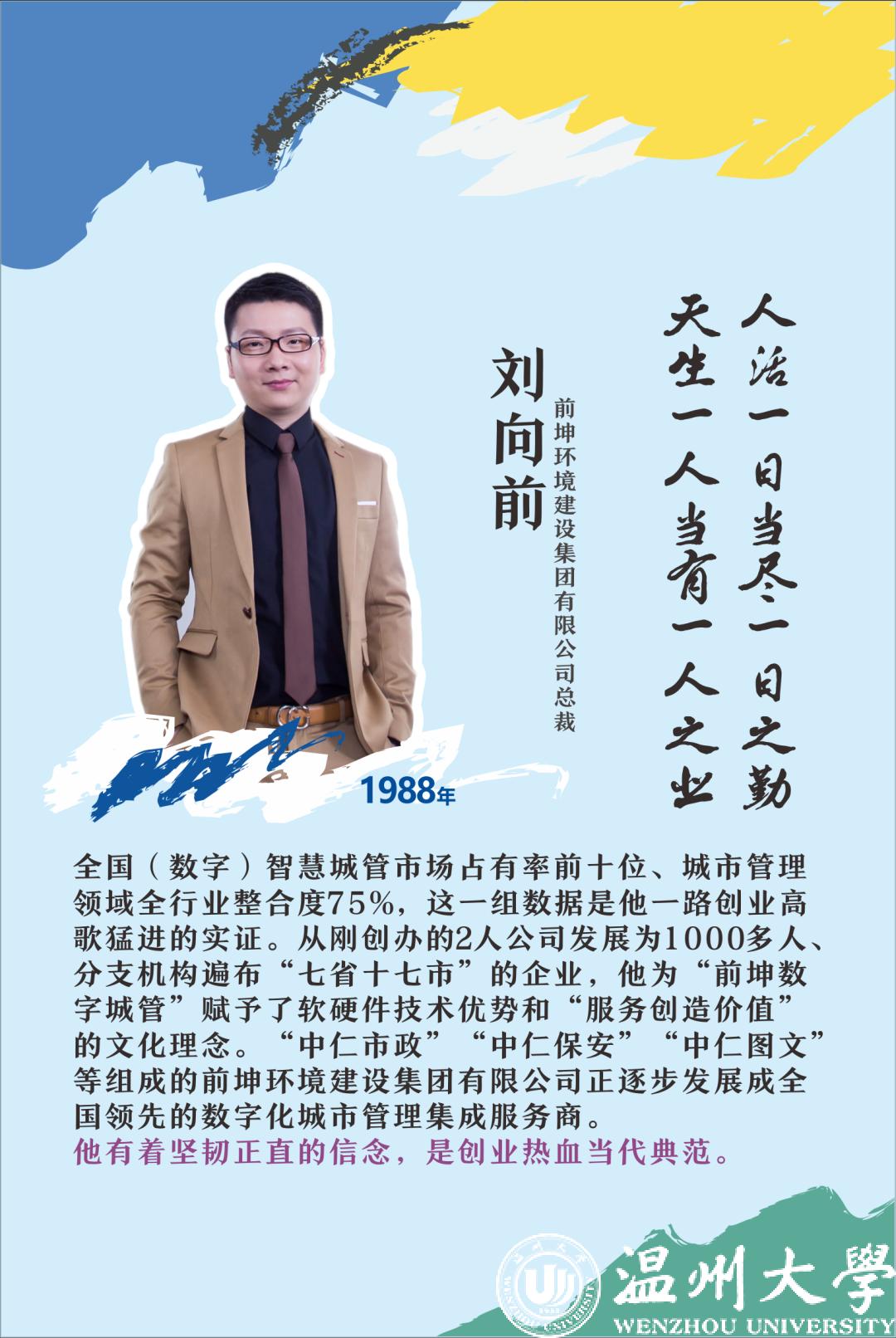 他,就是瓯海区新生代企业家联谊会副会长、前坤环境建设集团有限公司总裁——刘向前。